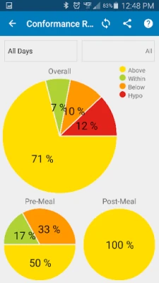 Conformance Report - This report displays pre- and post- meal glucose results in a pie chart format. Each pie chart is divided into color coded sections identifying the percentage of glucose results that are above, within or below targeted ranges for each testing time.